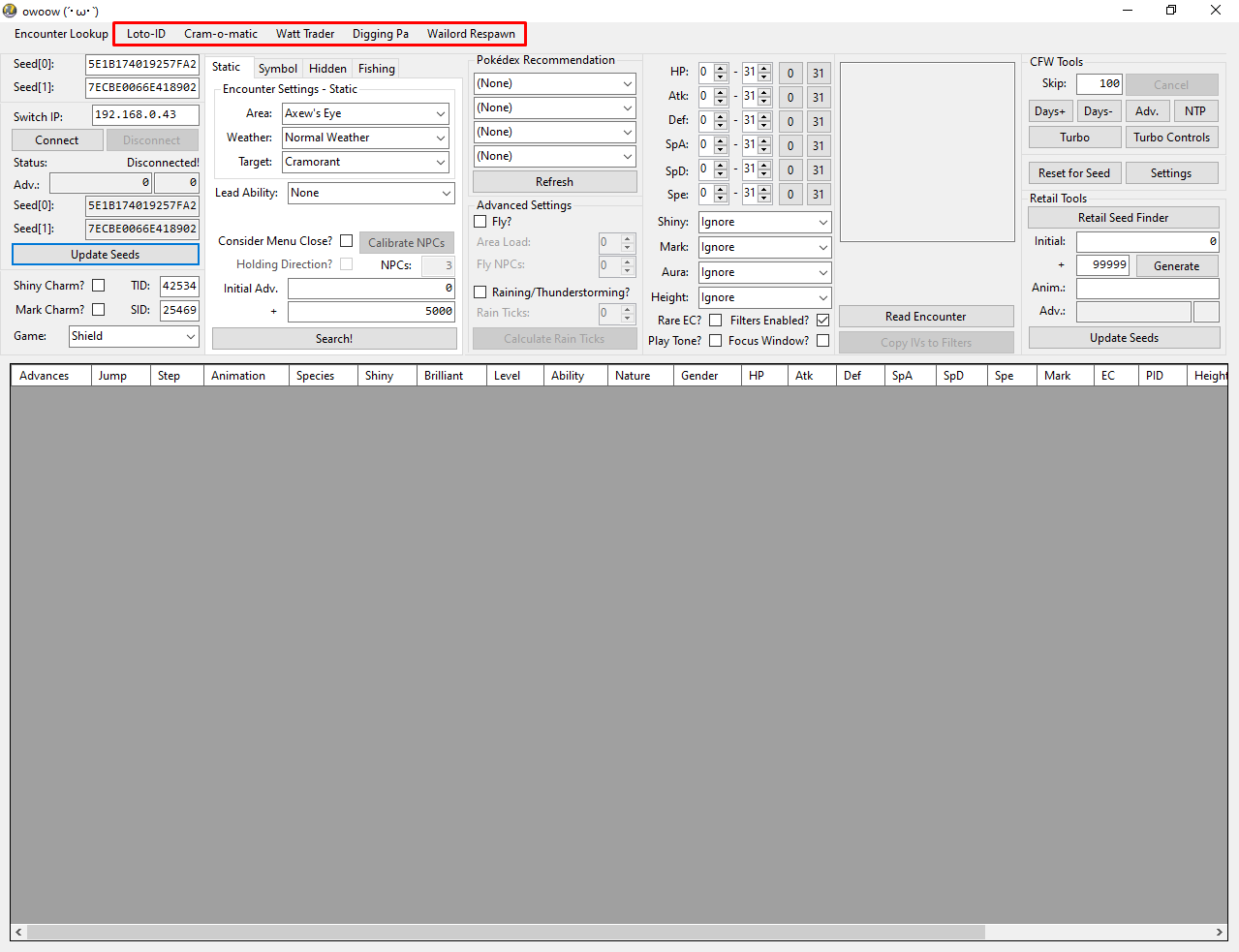 On the main window of owoow, you should see a navigation bar at the top of the program with multiple button options. Each button opens a tool for a type of item RNG manipulation.