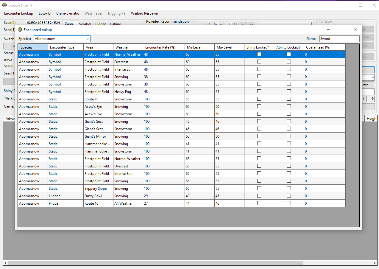 Clicking the Encounter Lookup button on the top-left of the main window will open a subwindow. Here, you can search for every possible encounter in the game for a specific species and select an encounter type based on your desired target.