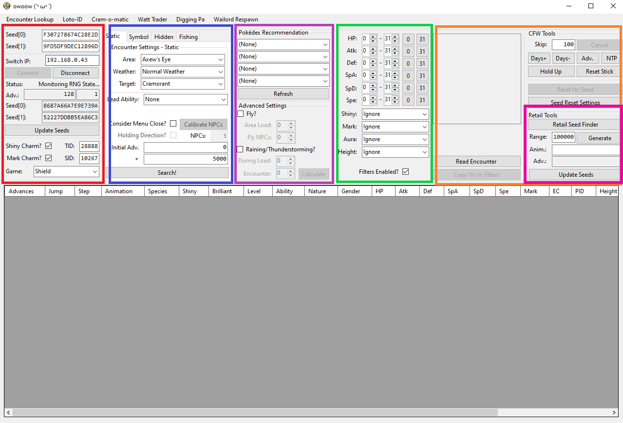Upon launching and connecting to owoow for the first time, you should see something similar to the above image. This tool calculates the details of upcoming Pokémon, then outputs the results in the table at the bottom based on user-defined search parameters.
