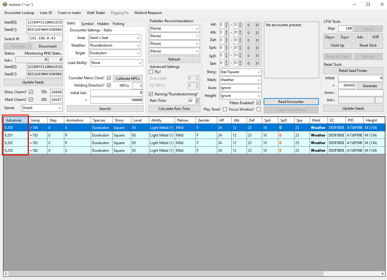 Connect. This will automatically read your current seed and save file details.Encounter Lookup in the top toolbar to open a subwindow. Enter the desired species name in the search field and select a STATIC encounter.Encounter Lookup window, then input the relevant Location, Weather, and Species information into the Encounter Settings section.+ field in Encounter Settings, then configure additional search filters such as Shiny, Marks, IVs, or Height.Figure 2 - Game Setup