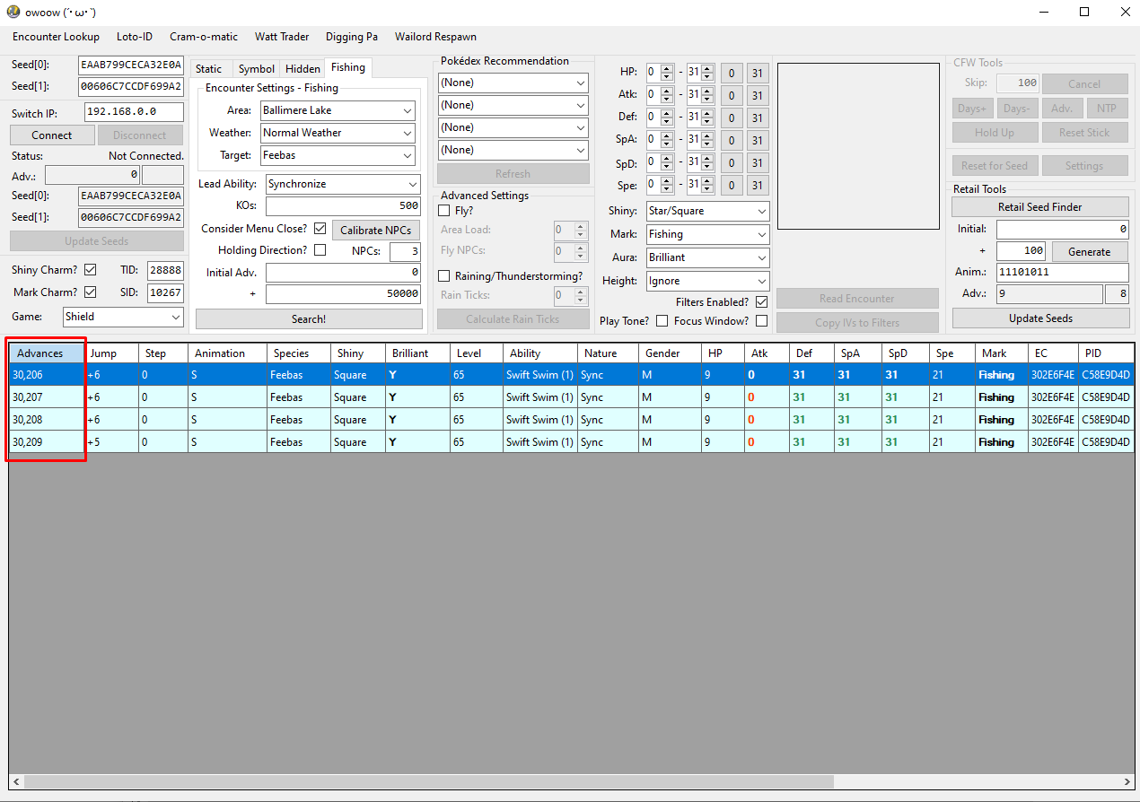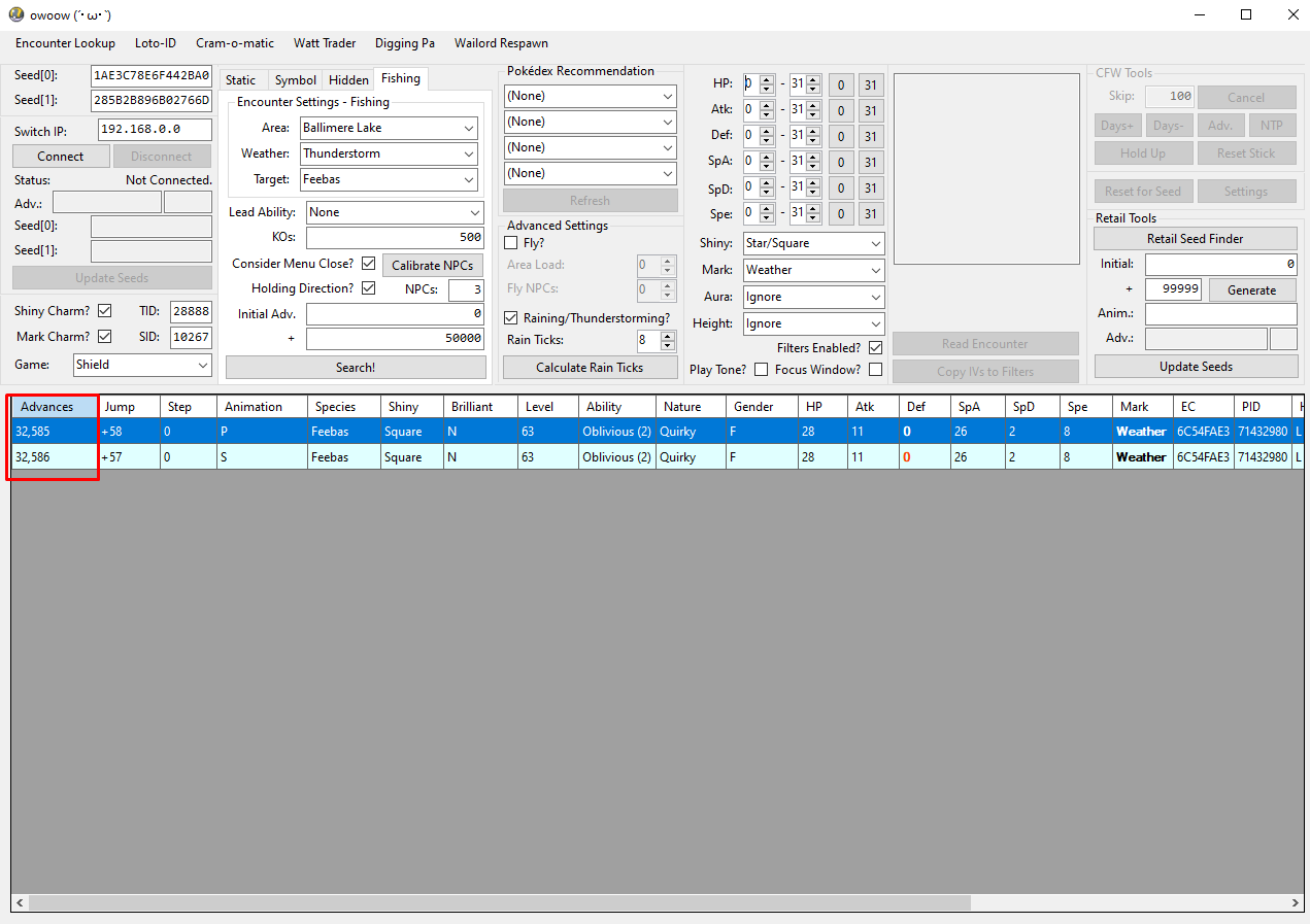 Retail Seed Finder.MenuCloseTimeline subwindow, verify that your NPC count has been entered into the main window and you have checked both the Consider Menu Close? and Holding Direction? checkboxes.Advanced Settings section, check the Raining/Thunderstorming? checkboxes. For the calibration, set the Rain Ticks value to 0.B while holding the correct direction on your joystick. If your positioning earlier was perfect, the fishing pool should immediately spawn.Advanced Settings, click the Calculate Rain Ticks button. If you did this correctly, you should see a result pop up. Enter the calibrated value into the Rain Ticks field.The calibration fields (Consider Menu Close? / Holding Direction? / Rain Ticks) account for the advances consumed when leaving the party list and closing the X Menu. Make sure you have the correct boxes checked; the search result table uses these checkboxes to calculate the exact frame on which to close the party list and spawn your target Pokémon.